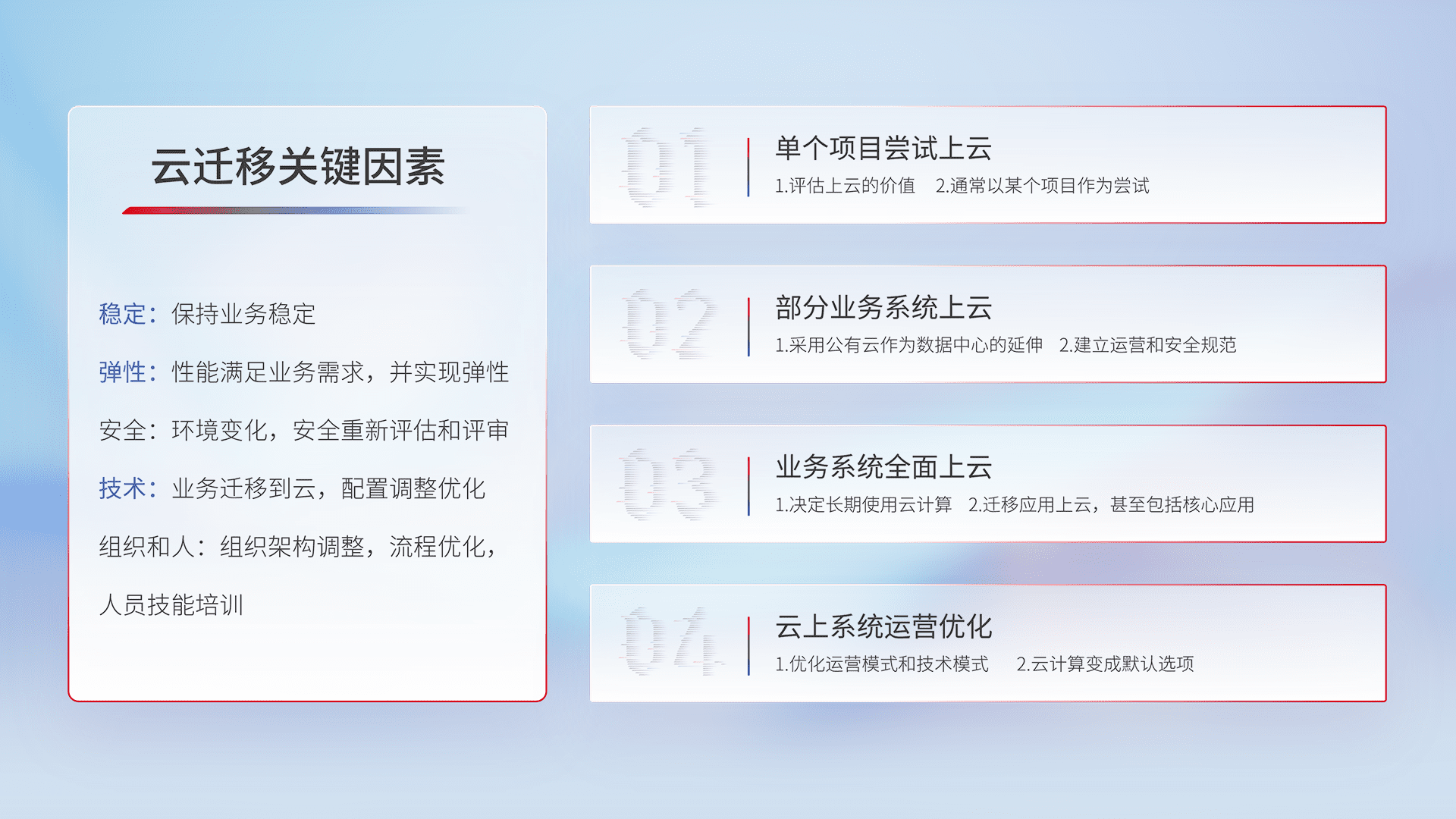 结合实际业务,,从规划设计、、、、云平台选型、、、云原生改造、、、数据迁移、、集成交付,,,,迁移全过程为客户识别最佳上云路径,,,做好风险识别管理,,设计网络架构、、、、身份权限、、、安全审计合规、、操作审计、、、、日志审计、、、、监控告警策略、、、多站点容灾设计等,,对云上基础设施进行整体规划,,,,提升IT治理水平,,,,以满足弹性、、、、高可用、、高性能的需求。。