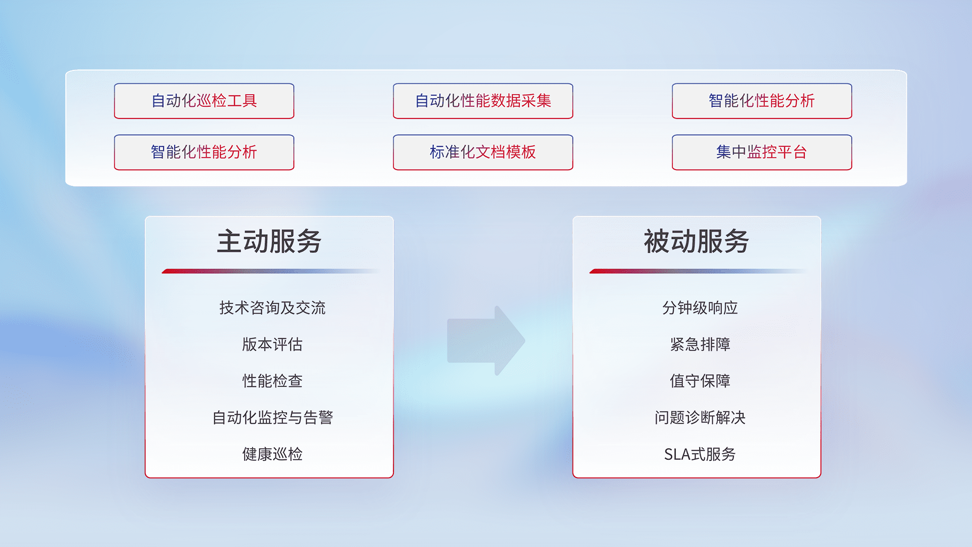 智能化工具和标准化文档,,保障服务质量,,提供主动服务(包含技术咨询、、、、版本评估、、性能检查、、自动化监控与告警、、、健康巡检)和被动服务包含(分钟级响应、、、紧急排障、、值守保障、、、问题诊断解决、、、SLA服务)。。。。